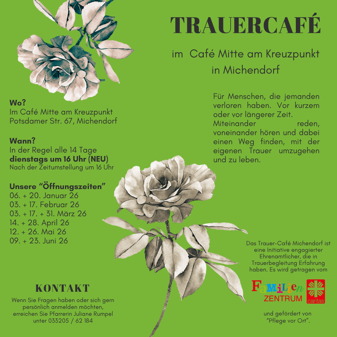 In Michendorf ist dieses Angebot neu und erreicht hoffentlich all jene, denen es gut tut in den Austausch zu gehen, über die eigene Trauer zu sprechen, Menschen zu treffen, denes es ähnlich geht. Es gibt Kaffee und Kuchen. Jede kann kommen, wann immer es gut tut und auch wegbleiben, wenn anderes wichtiger ist. Keine Anmeldung erforderlich. Wir freuen uns auf Sie!